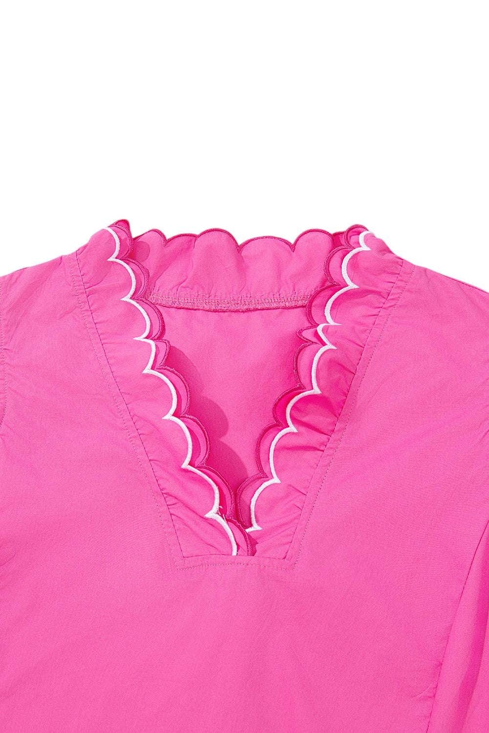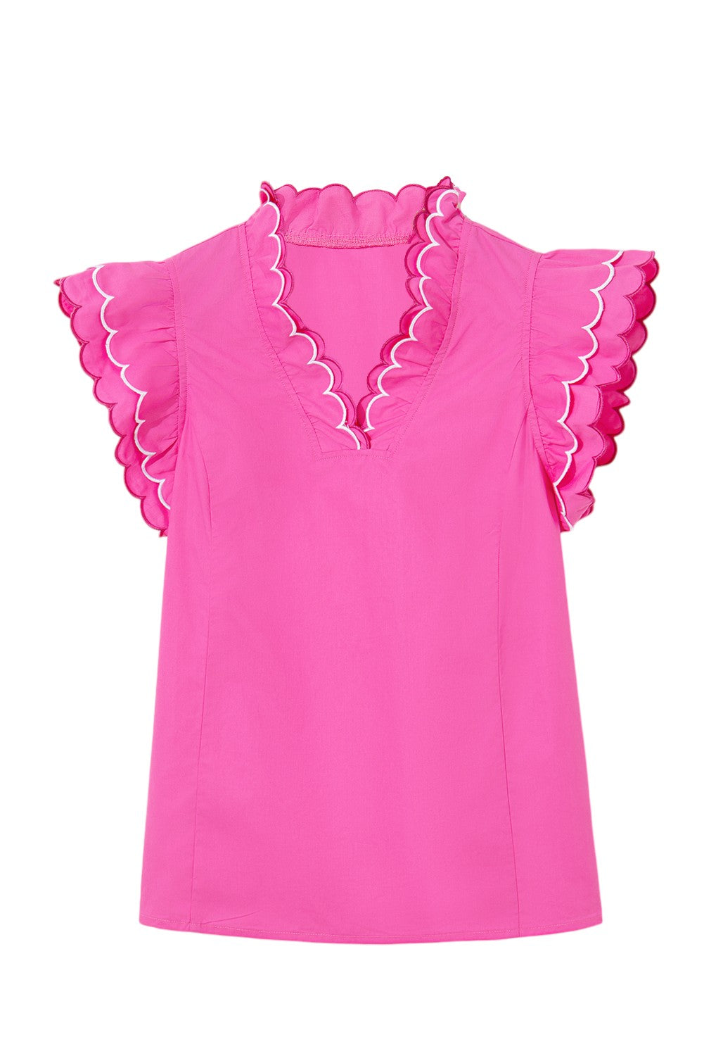 This blouse stands out with its layered V-neck and ruffled short sleeves, offering a distinctive and feminine look. Scalloped edges adorn both the neckline and sleeves, adding delicate detail. Designed with a relaxed fit, it flatters all body types while providing lightweight comfort for all-day wear.