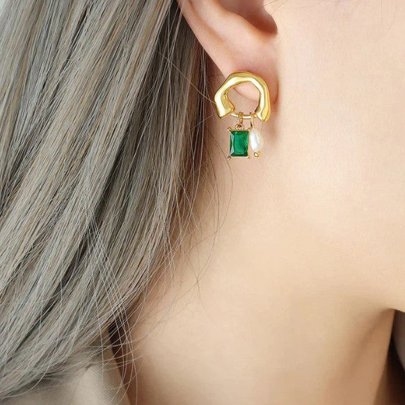 Make a statement with these Gold Pearl and Emerald Drop Earrings. Featuring a unique abstract gold frame adorned with a green emerald-cut stone and a delicate freshwater pearl, these earrings add elegance and sophistication to any outfit.