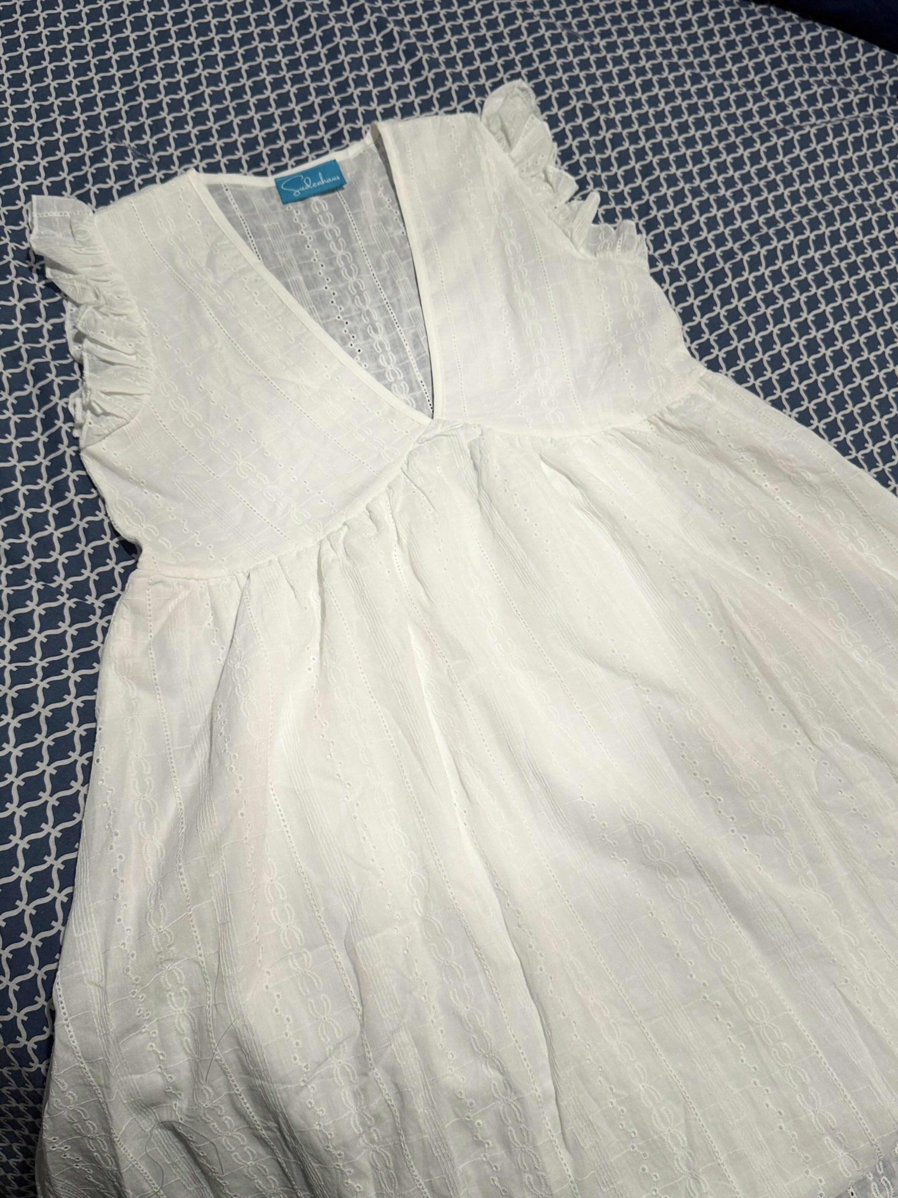 Sudenhaus 100% Cotton White Eyelet Mini Dress with Ruffled Sleeves
