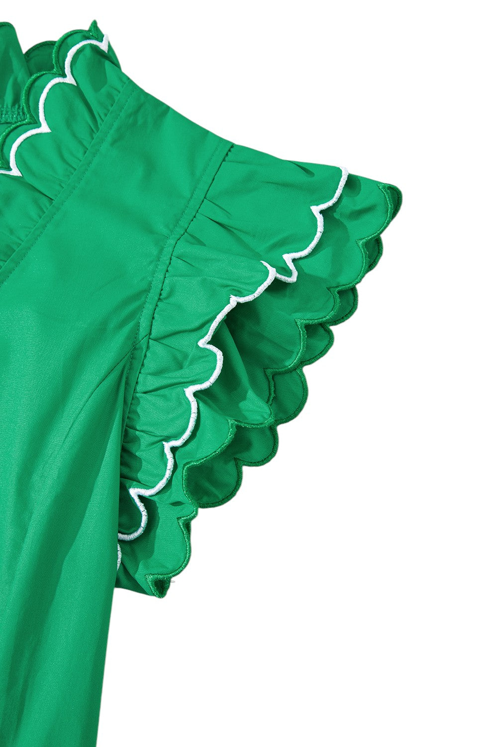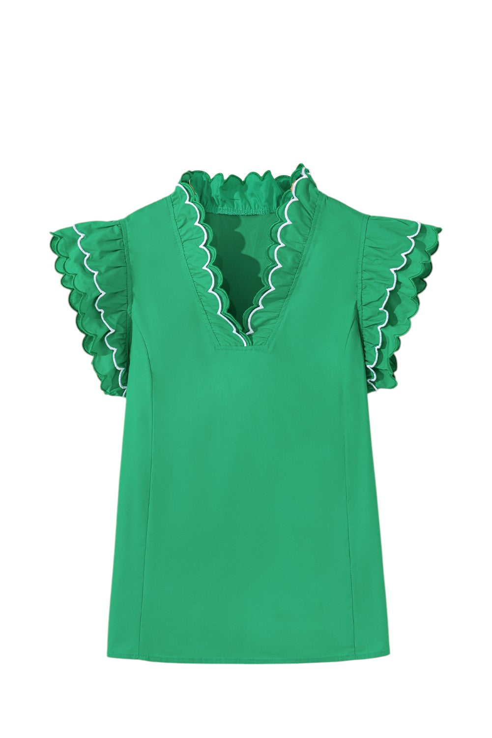 This blouse stands out with its layered V-neck and ruffled short sleeves, offering a distinctive and feminine appeal. Scalloped edges adorn both the neckline and sleeves, enhancing its delicate design. Its loose fit accommodates all body types comfortably, while the lightweight fabric ensures ease and comfort throughout the day.